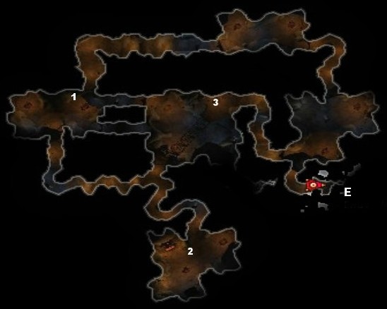 TROUÉE DU ROHAN La Grotte sous le camp de Cuvnerth E - Entrée et Sortie ( 88.2 S 11.4 O ) 1 - Provisions à détruire 2 - Provisions à détruire 3 - Provisions à détruire